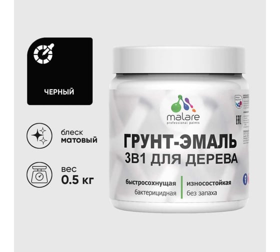 Грунт-Эмаль 3 в 1 для деревянных поверхностей MALARE, акриловая, моющаяся, без запаха, матовая, черный, 0.5 кг 4660504704130