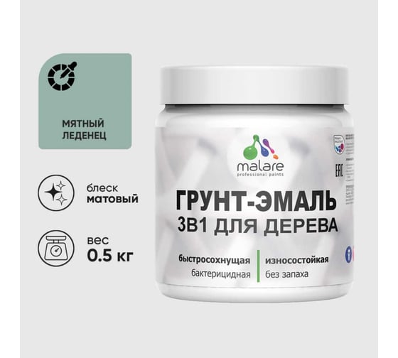 Грунт-Эмаль 3 в 1 для деревянных поверхностей MALARE, акриловая, моющаяся, без запаха, матовая, мятный леденец, 0.5 кг 4660504703799