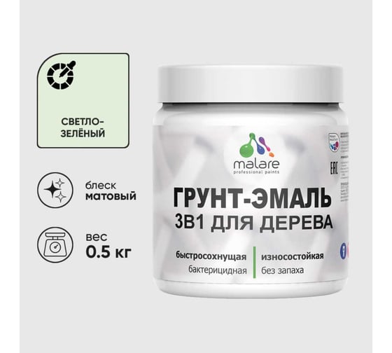 Грунт-Эмаль 3 в 1 для деревянных поверхностей MALARE, акриловая, моющаяся, без запаха, матовая, светло-зеленый, 0.5 кг 4660504703966