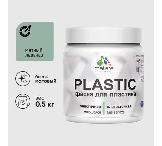 Акриловая краска для пластика MALARE Plastic для ПВХ, для подоконников и откосов, без запаха, матовая, мятный леденец, 0.5 кг 4660504715778