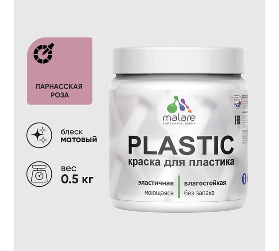 Акриловая краска для пластика MALARE Plastic для ПВХ, для подоконников и откосов, без запаха, матовая, парнасская роза, 0.5 кг 4660504715839