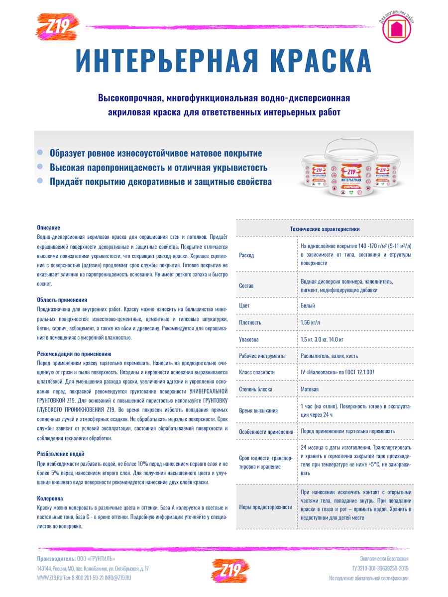 Акриловая краска Z19 ИНТЕРЬЕРНАЯ для стен и потолков, супербелая, 3.0 кг 60222 используется во время работ по окраске стен и потолков внутри сухих жилых и производственных помещений.