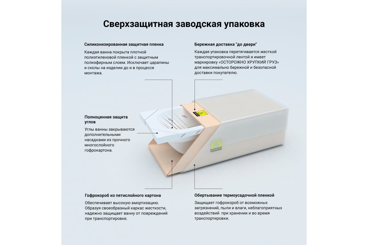 Конструкция ванны предполагает установку на поперечные ножки или усиленный металлический каркас с максимальной нагрузкой до 500 кг и предусматривает дополнительную фиксацию к стене. Наличие регулировок на каждой ножке и распорках обеспечивает удобство установки на различных поверхностях.