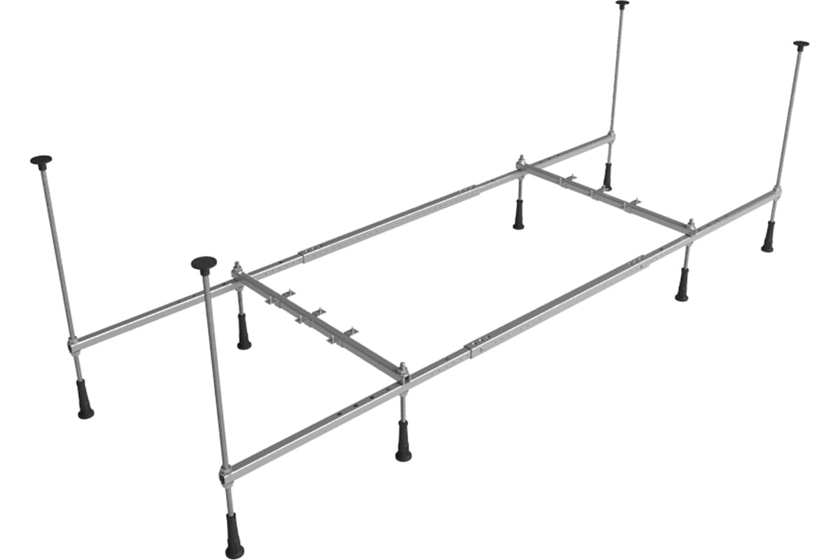 Конструкция ванны предполагает установку на поперечные ножки или усиленный металлический каркас с максимальной нагрузкой до 500 кг и предусматривает дополнительную фиксацию к стене. Наличие регулировок на каждой ножке и распорках обеспечивает удобство установки на различных поверхностях.