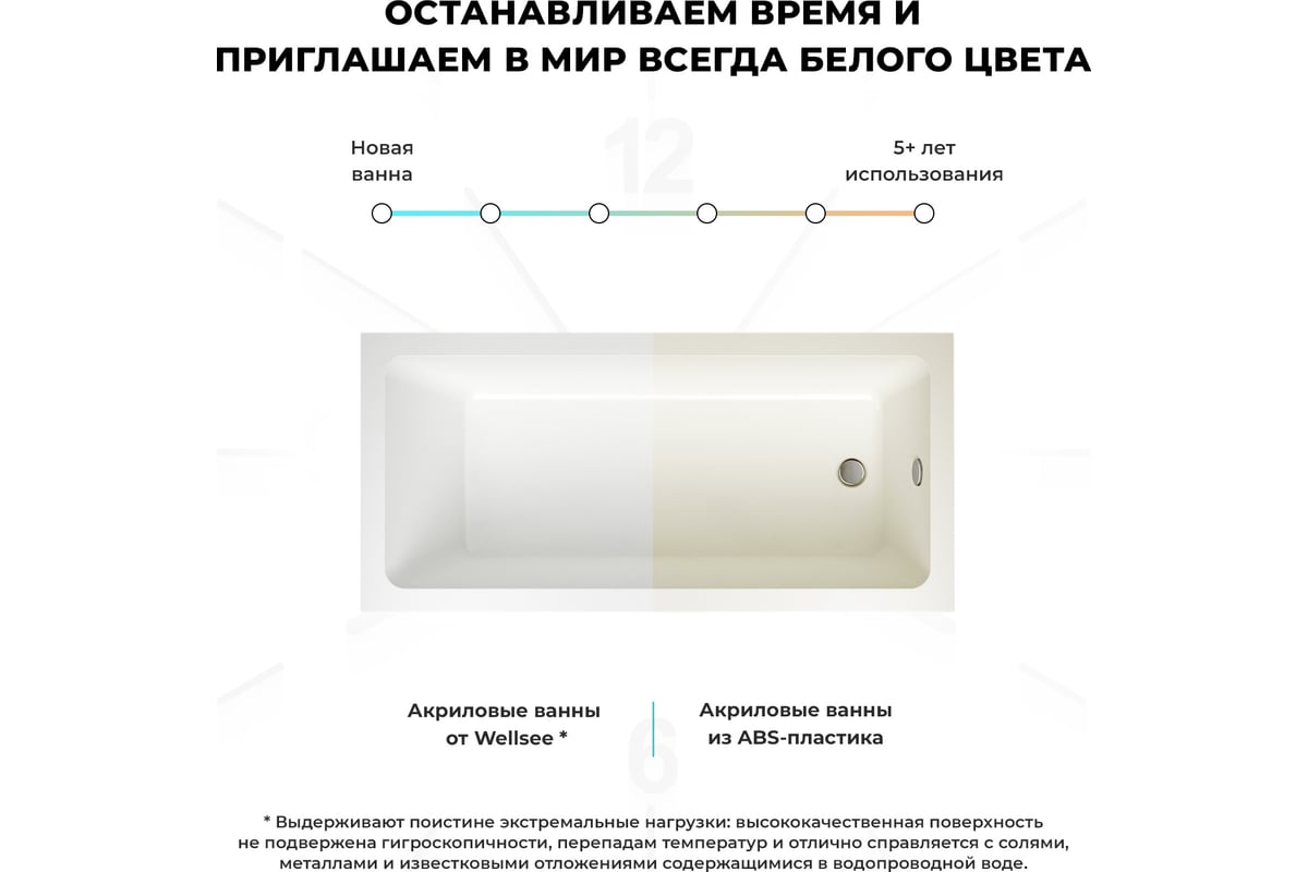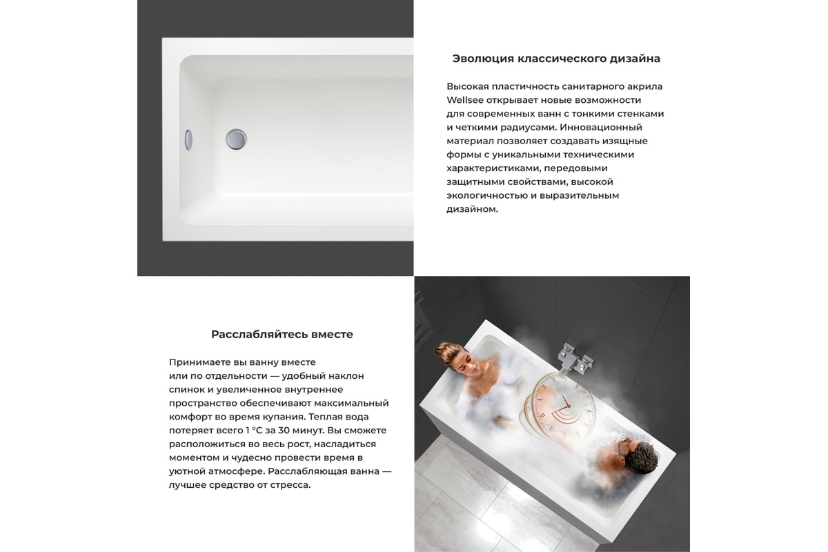 - Базовое исполнение акриловых ванн Wellsee может быть дополнено системами аэро- и гидромассажа, хромо- и ароматерапии, декоративной подсветкой, встроенными водонепроницаемыми bluetooth-колонками и подголовниками для максимального комфорта и оздоровления тела