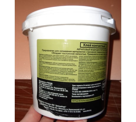 Странный какой-то этот клей. Очень напоминает ПВА, но без характерного кислого запаха. И инструкция по применению тоже непонятная. Если клей контактный, то это как правило подразумевает образование первичной пленки на обоих склеиваемых поверхностях через 1-5мин. после нанесения, после чего их следует плотно прижать друг к другу. Здесь же об этом ничего не сказано, и непонятно - то ли их нужно сложить и прижать сразу же после нанесения клея, то ли через некоторое время, когда образуется первичная пленка. Написано лишь то, что их нужно «совместить и плотно прижать на несколько секунд» и что для повышения прочности его нужно нанести на обе поверхности. Я нанес данный клей на полотнище из ВПЭ и на поверхность, куда его требовалось приклеить. Ждал минут 15, но пленка все никак не образовывалась, потом сложил поверхности и плотно прижал по всей площади. Спустя час посмотрел – а клей этот так и остался жидким и ничуть не застыл. За это время другие контактные клеи уже застывали, и было видно, что процесс склейки идет.