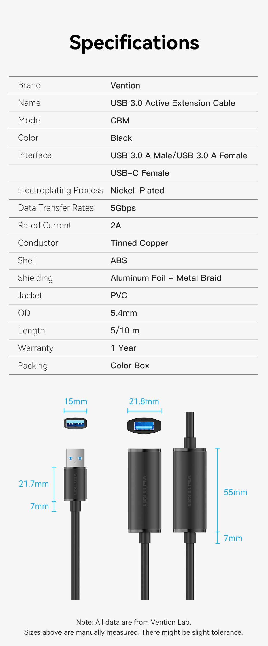 Внешний интерфейсный кабель для синхронизации и передачи данных периферийных устройств и их компонентов с разъемом USB, в основном используется, как удлинитель. Чип - усилитель обеспечивает бесперебойную, непрерывную работу по всей длине кабеля при передаче сигнала. Для усиления мощности сигнала, имеется разъем USB-C(2 Ампера). Кабели длиной от 10 метров и более выполнены с дополнительным чип - усилителем.