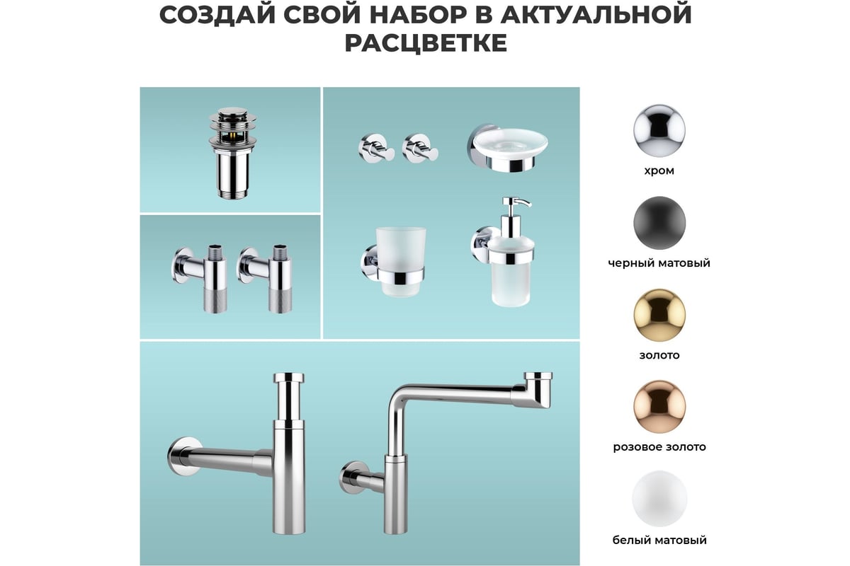 Завершить современный интерьер ванной комнаты можно с помощью сифона, донного клапана, угловых вентилей (2 шт), набора аксессуаров (5 шт) и элегантными зеркалами 7 Rays' Spectrum.