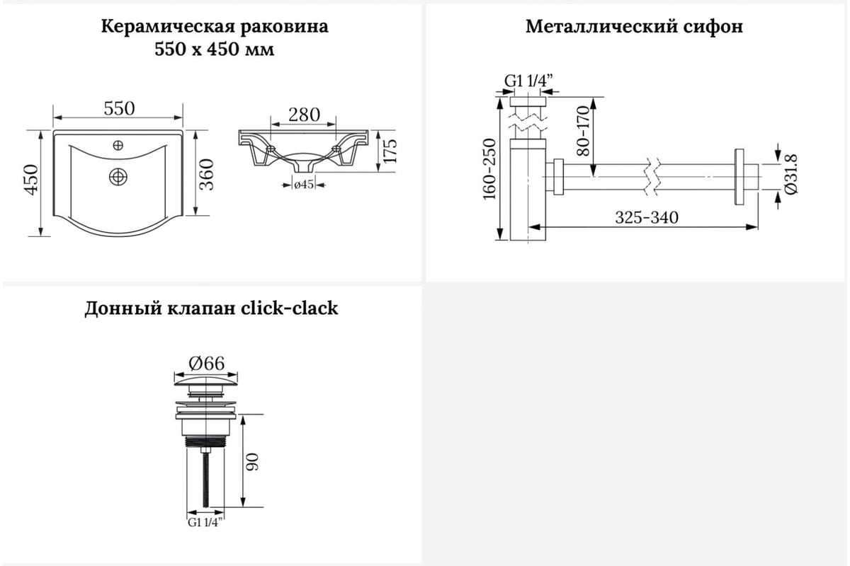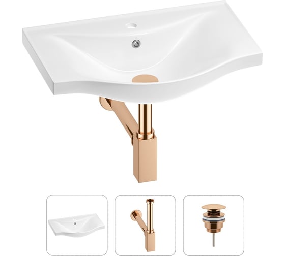 - 1 х керамическая раковина, арт. 151203000 (размер 55*45 см, цвет глянцевый белый); 1 x декоративная заглушка на отверстие перелива раковины (цвет хром); 1 x сифон для раковины, арт. 182112000 (цвет розовое золото); 1 x универсальный донный клапан для раковины, арт. 182142000 (цвет розовое золото); 1 x комплект креплений для монтажа; 2 x инструкция по монтажу и эксплуатации; 2 x гарантийный талон.