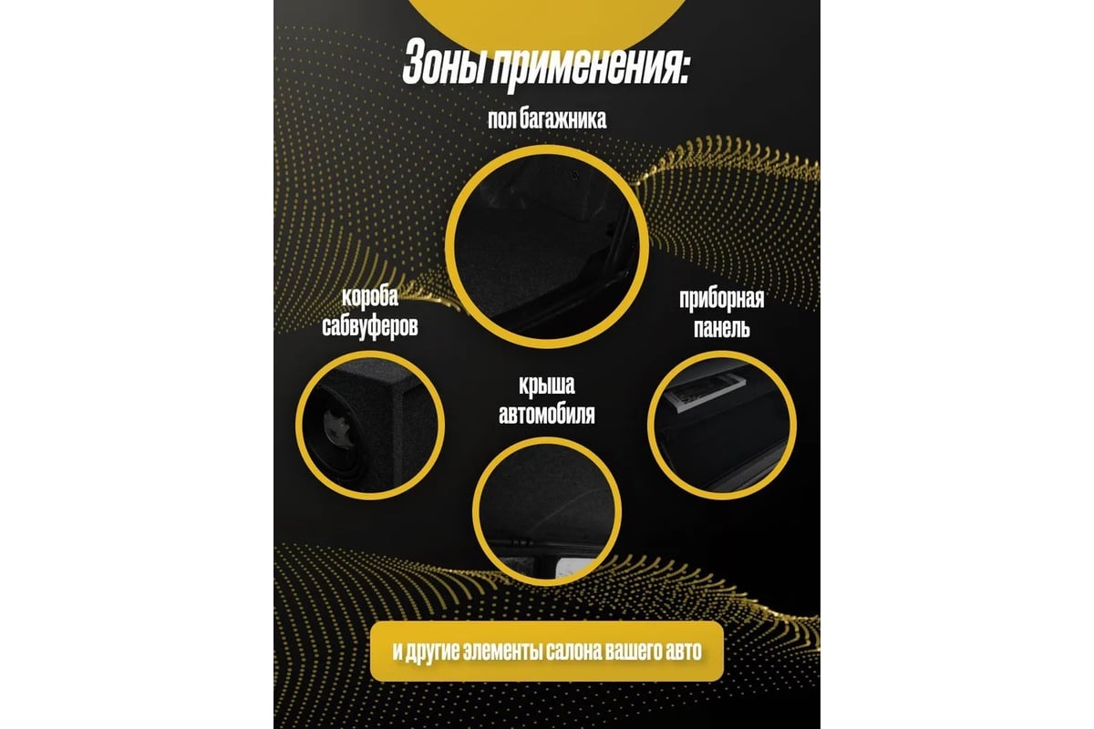 SGM Карпет для авто акустический КС черный. Карпет имеет самоклеящийся слой и состоит из нетканого ворсованного материала- полиэфирного (или полипропиленового) волокна. Материал подвержен растяжению без существенного изменения внешнего вида лицевой поверхности, что позволяет обрабатывать поверхности сложной формы.