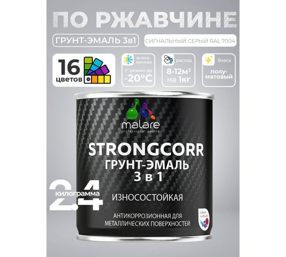 Грунт-Эмаль 3 в 1 по ржавчине MALARE StrongCorr, алкидно-уретановая, полуматовая, сигнальный серый, 2,4 кг 2036769895937