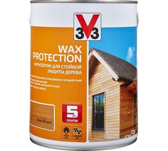 Алкидный антисептик для дерева с добавлением воска V33 WAX PROTECTION золотой дуб 117377 защищает дерево от ультрафиолетовых лучей, атмосферных осадков и микроорганизмов, предотвращает разрушение и гниение.