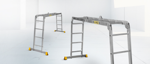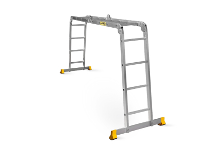 Лестница шарнирная алюминиевая четырехсекционная профессиональная– представляет собой лестницу-трансформер, состоящую из четырех секций,последовательно соединенных между собой стальными шарнирами. Шарнины имеют три угла фиксации,которые обеспечивают лестнице положения: -приставная, -стремянка, -приставная под крышу, -помост только для Т433, Т444(исключительно с штатной площадкой.В комплект не входит).