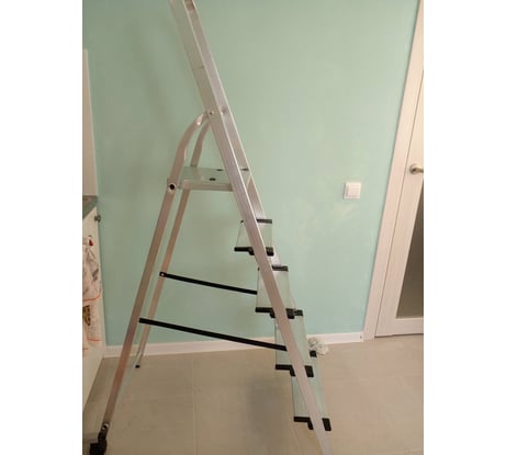 Отличная стремянка, хотел взять 5 ступеней, но 6 ступеней была дешевле)))). Не шатается, очень устойчивая. Давно хотел с широкими ступеньками. Доволен.