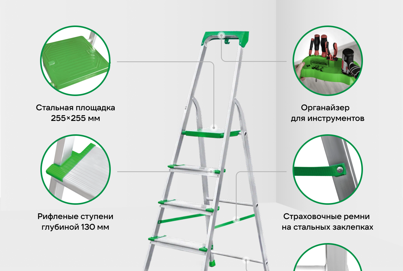 Хорошая стремянка, но почему-то жена больше всех радуется. Приобретал для дачи и сада.