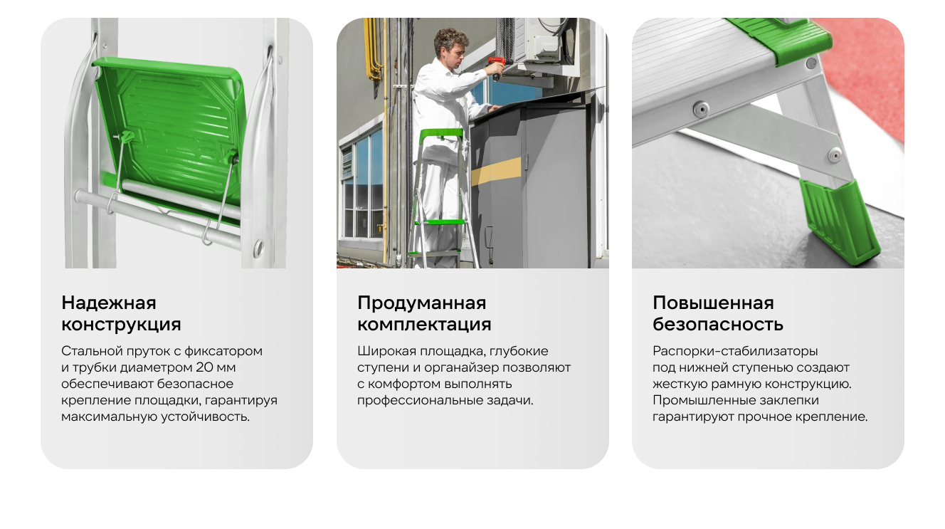 - Закруглённые безопасные края ступеней и площадки смягчают контакт с голенью, предотвращают травмы.