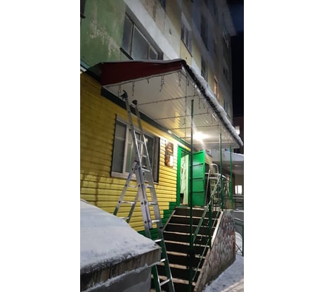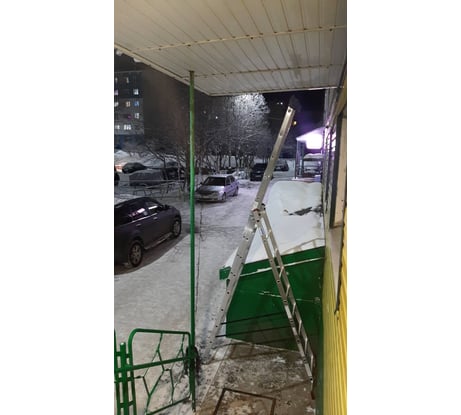 Лестница вызывает восторг. Подтверждаю все ранее высказанные достоинства. Безусловно лестница очень удобная, сборка превосходная, конструкция продуманная. Я вешу 102 кг и чувствую себя уверено на высоте 4м., очень уверенно. Брал для обслуживания крыш магазинов и офиса, теперь "снять" снег и наледь с крыши, повесить гирлянды, камеры, помыть крышу, опоры ну и т.п. необременительная процедура, а удовольствие. Длина 2.5 в сложенном виде, общий вес 13 кг. Все манипуляции и трансформации лестницы легко делать одному. В снегу устойчива, особенно улыбнула возможность её установки на лестничные марши, можно обслужить крышу над подъемным маршем. Ведь приставную лестницу не поставишь в центр, нужна точка опоры. На фото высота крыши 4м