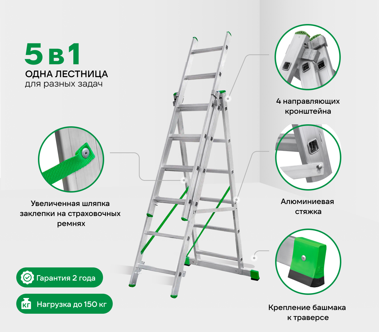 Многозадачность. Приспособление можно использовать в качестве приставной лестницы, приставной раздвижной лестницы, стремянки и стремянки с выдвижной секцией.