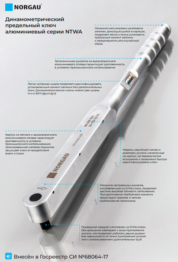 Динамометрический ключ предельный со шкалой 1"; 750-2000 Нм тип NTWA35-2000, NORGAU 051116200 подойдет для работы с крепежом, где требуется контроль усилия. Оптимально подходит для мастерских, автосервисов и производств.