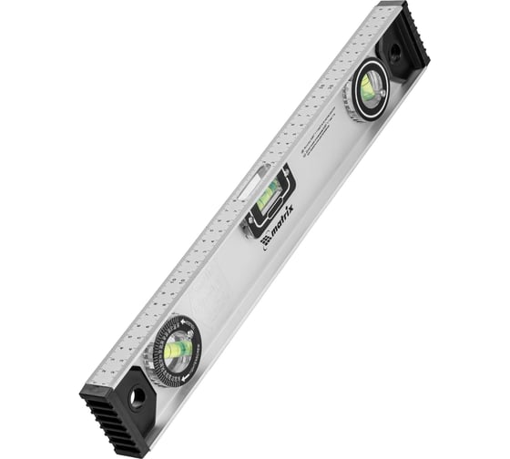 Алюминиевый уровень Matrix «Рельс» 34020 длиной 400 мм имеет 3 глазка: 2 для проверки отклонений от заданной вертикали и горизонтали и 1 поворотный для проверки наклонных поверхностей.
