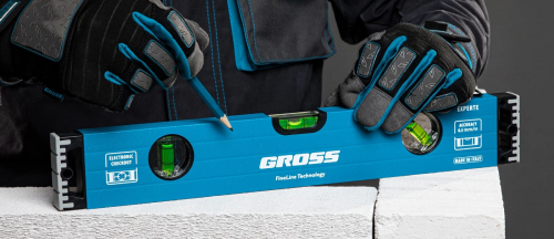 Алюминиевый уровень 400 мм, усиленный с ударопрочными заглушками, 3 глазка GROSS 34324 подойдет для эксплуатации в сложных, стесненных условиях.
