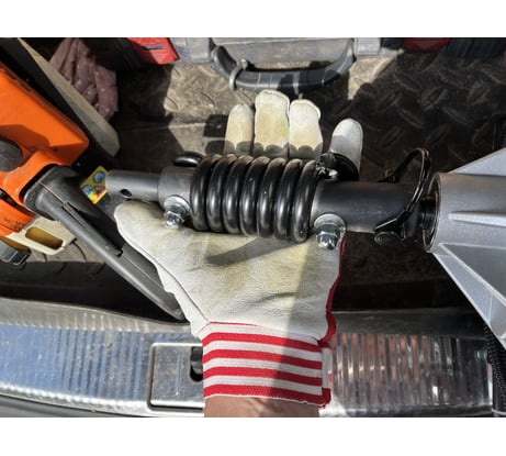 Был бы отличным, если бы производитель не сэкономил на метизах. Гайки постоянно откручивались, а болты порвало на первом же корешке в земле. При этом штифты, которыми крепится к оси бура и шнека, даже не поцарапались особо. И это у меня еще бур не слишком мощный. Позабавила маркировка класса прочности на шляпке болта - 12.9. По факту это простой мебельный болт с прочностью, видимо, 4.8. Спишем на то, что производителя просто обманул поставщик. Остальные детали сделаны качественно. Болты там DIN603 М8х55. Если порвет - заменяется обычным закаленным болтом М8х60мм. У обычных болтов шляпка маловата и лучше шайбу положить под шляпку. Особенно если болт под шестигранник. Я еще после шляпки и шайбы одел ось от старого подшипника, чтобы пружина лучше упиралась в болт. И гайки с фторопластом, чтобы не откручивались сами по себе. Ну или на фиксатор резьбы их закрутить.