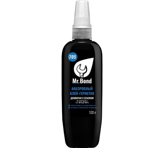 Анаэробный герметик Mr.Bond 705 демонтаж с усилием, синий, 100 г MB4070500100 используют для надежной фиксации резьбовых соединений труб и фитингов во время монтажа систем водоснабжения, газоснабжения и отопления.