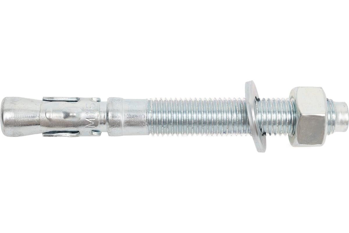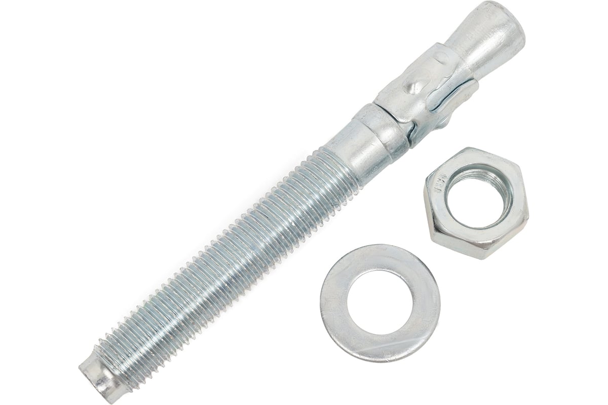 Клиновой анкер представляет собой крепежный элемент в виде шпильки с резьбой, на одном конце которой располагается шайба с гайкой, на другом - распорный узел с муфтой в форме конуса.