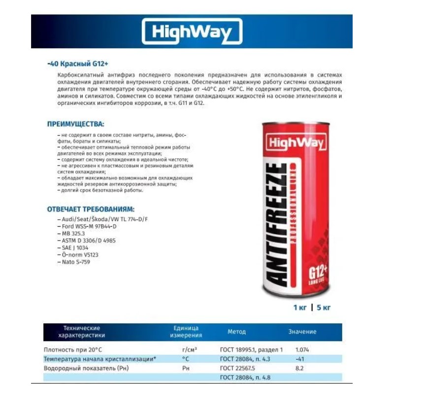 Антифриз HighWay ANTIFREEZE-40 LONG LIFE G12+, красный, 1 кг 10003 предназначен для использования в системах охлаждения двигателей внутреннего сгорания. Обеспечивает надежную работу системы охлаждения двигателя при температуре окружающей среды от -40°С до +50°С. Не содержит нитритов, фосфатов, аминов и силикатов. Совместим со всеми типами охлаждающих жидкостей на основе этиленгликоля и органических ингибиторов коррозии, в т.ч. G11 и G12.