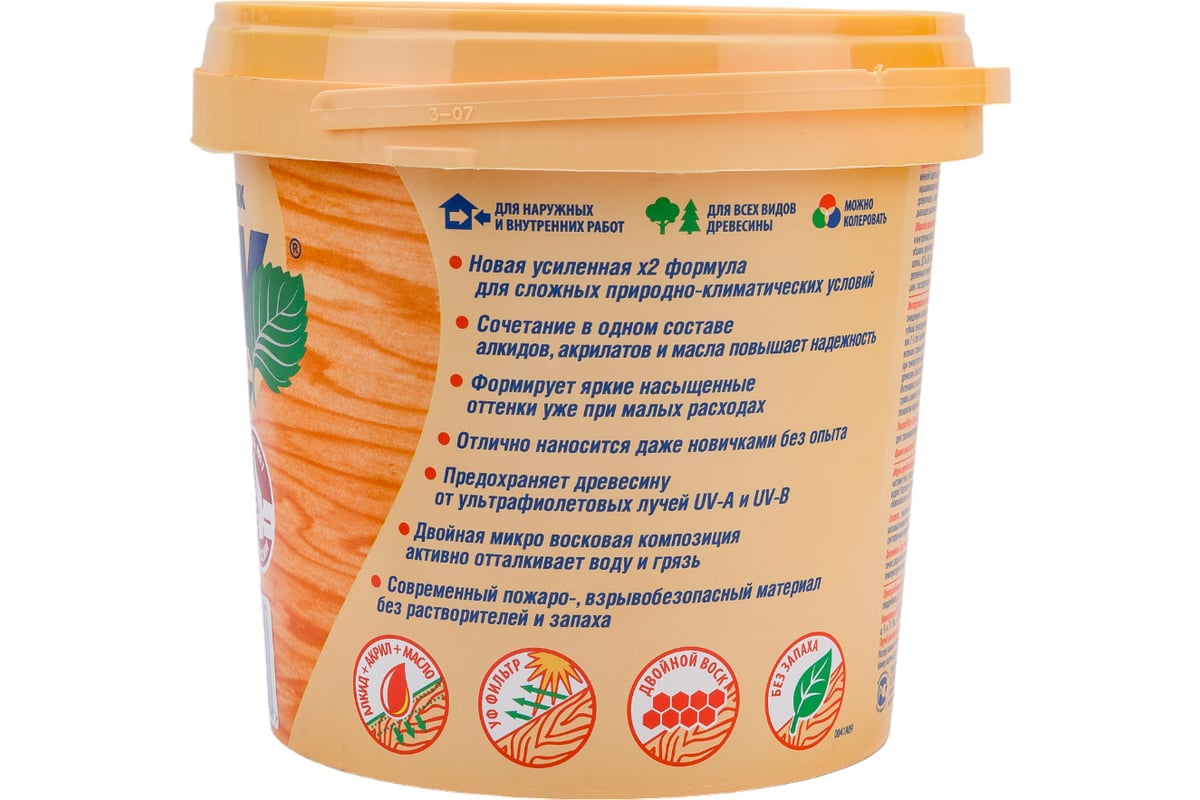 Состав:состав на алкидно-акрилатной основе с добавлением льняного масла, биоцидов, активных УФ-фильтров, микровосков
