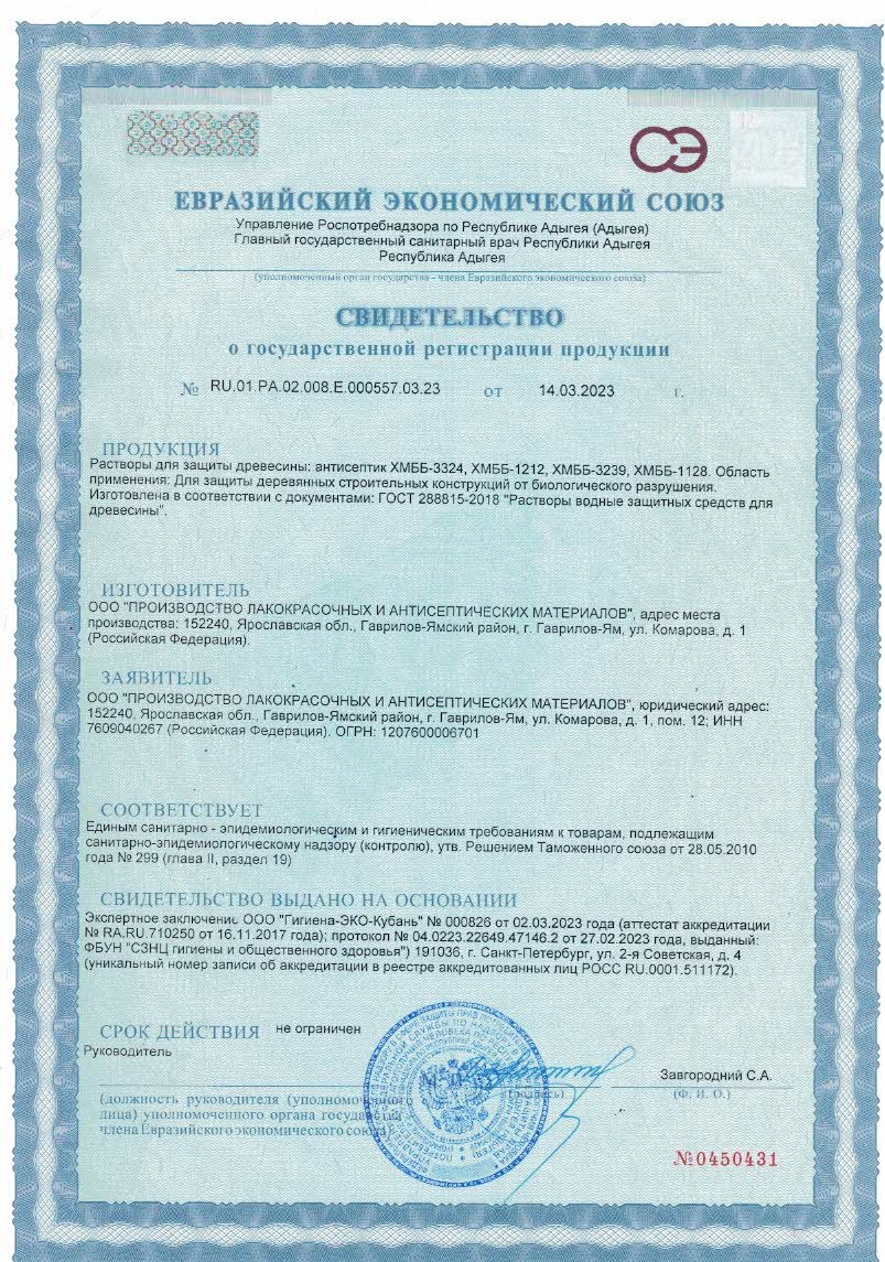 Антисептик ХМББ-3239 произведён по ГОСТ28815-18. Антисептик предназначен для защиты деревянных строительных конструкций от биологического разрушения (грибов гниения, синевы, плесени, поражения насекомыми древоточцами) в условиях умеренного вымывания, промерзания, периодически образующийся на поверхности и стекающий конденсат. Объекты зашиты: каркасные дома, срубы, лаги, стропила, балки, несущие брусья, перекрытия и т.п.