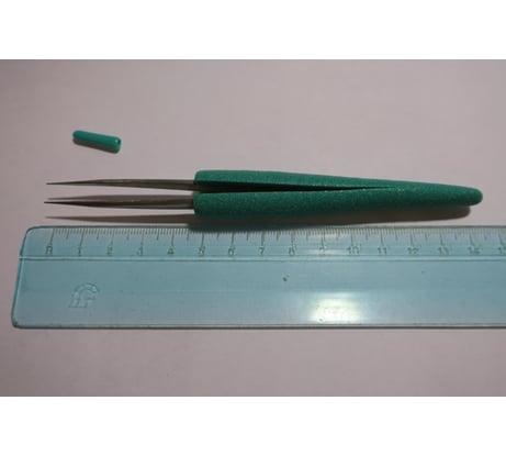 Длина губок без изоляции 50мм, длина пинцета 140мм. Толщина кончиков 0,5мм. Рекомендую.