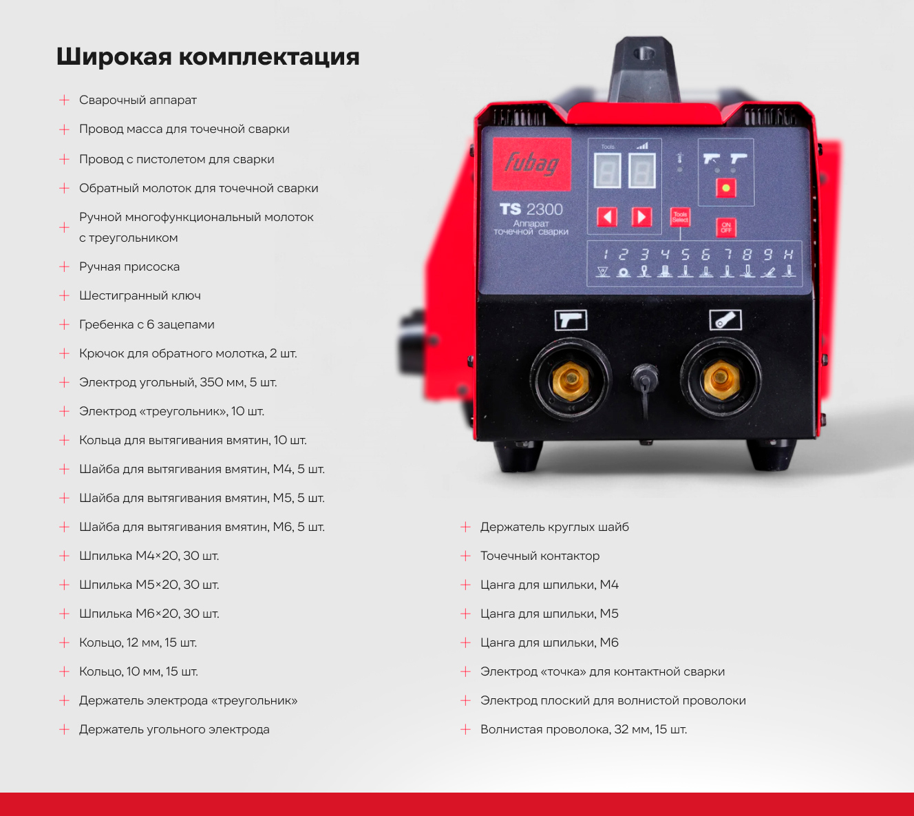 Fubag TS 2300 – это высокоэффективный аппарат для точечной сварки, специально разработанный для широкого спектра кузовных работ в автомастерских. Идеально подходит для вытяжки деформированных поверхностей на кузове автомобиля благодаря использованию специализированных инструментов.
