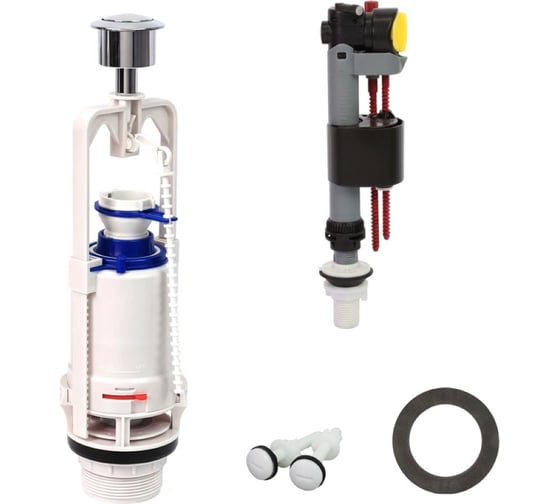 Комплект арматуры для керамических или пластиковых бачков. Включает смывную колонку с хромированной кнопкой, универсальный наполнительный клапан (боковое/нижнее подключение резьба 1/2"), прокладку, крепежные болты и фильтр.