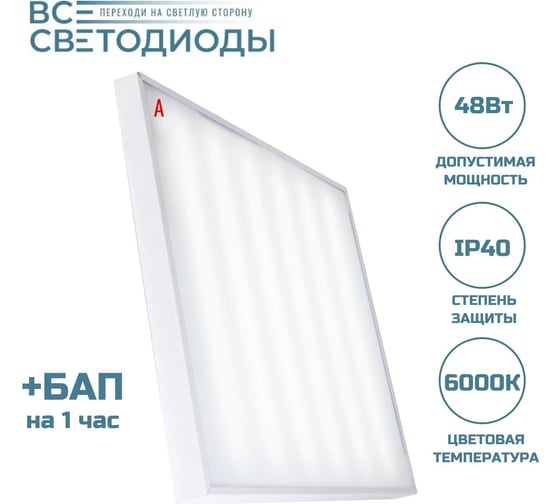 Вопросы и ответы о светильнике ВСЕСВЕТОДИОДЫ Армстронг 48 Вт, 5700 Лм, 6000К, IP40, Опал, БАП на 1 час vs203-48-op-6k-li1h