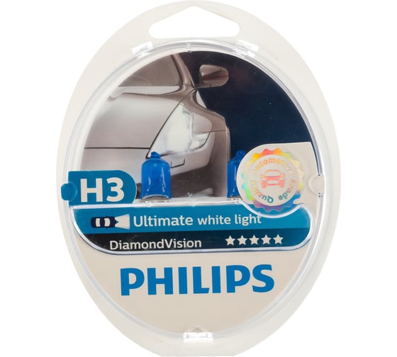 Автолампа PHILIPS H3, 55 PK22s DIAMOND VISION 5000K 2 шт. 12V 1,5,30 12336DVS2 применяется как источник света фар автомобилей с бортовой сетью напряжением 12 В.