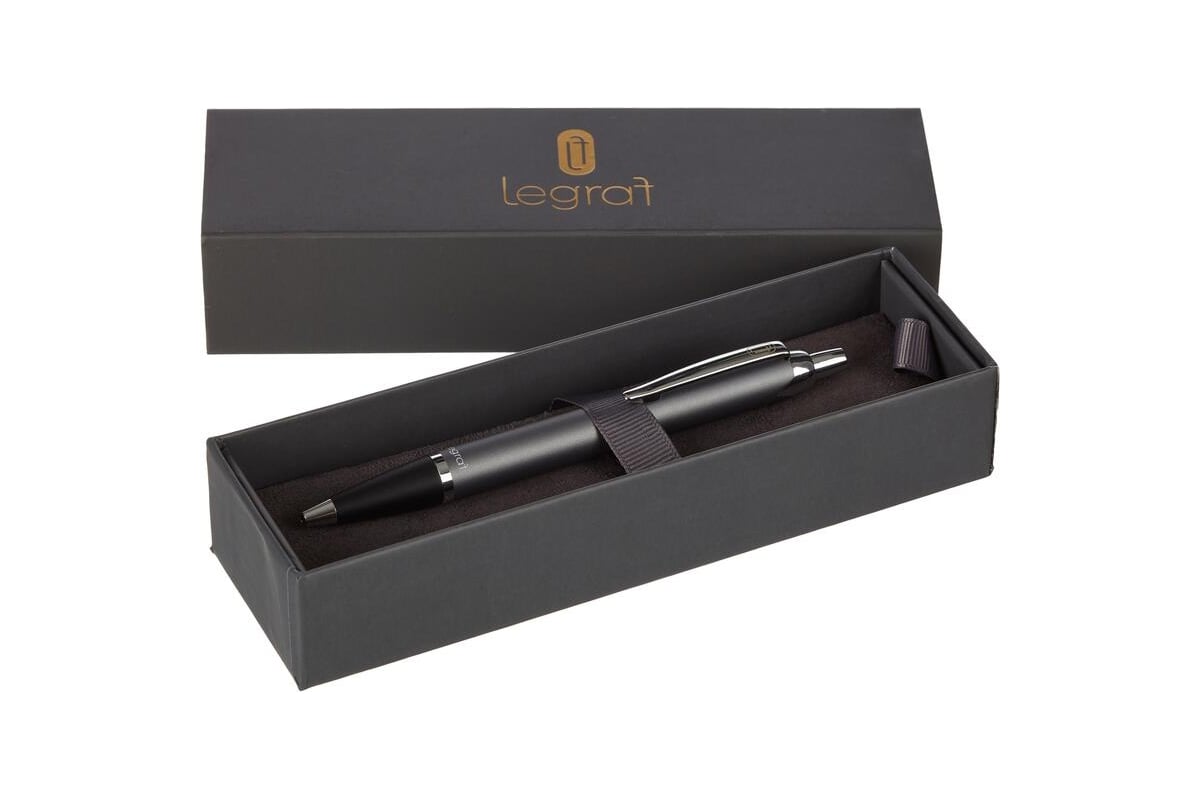 Шариковая ручка Legraf Rouan скнопочным механизмом выполнена излатуни. Корпус имеет матовое серое покрытие идетали серебристого цвета. Ручка поставляется впрестижной подарочной коробке. Толщина линии письма 0.5мм. Цвет чернил— синий.