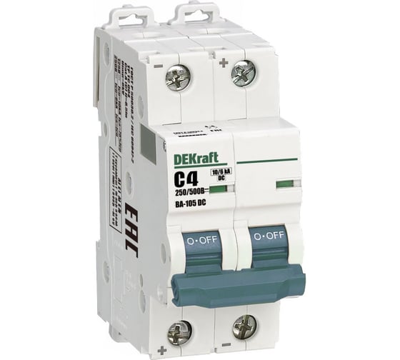 Автоматический выключатель серии ВА-105 DC Dekraft; 2P; ном. ток 4 А; характеристика C; откл. способность Icn = 10 кА при 250 В/6 кА при 500 В; установка – на DIN-рейку; ширина – 1 мод. х 18 мм. Выключатели ВА-105 DC применяются для защиты от перегрузки и КЗ в цепях постоянного тока, в частности в системах автоматизации и управления, транспорта, генерации и распределения электроэнергии и др. Окошко-индикатор всегда показывает состояние аппарата вне зависимости от положения рукоятки управления.