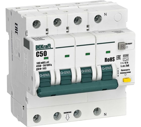 АВДТ ДИФ-103 Dekraft 3P+N, 50 А, 100 мА, тип A, кривая отключения C, 4.5 кА, 16656DEK