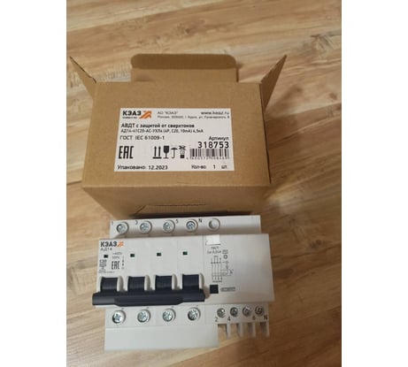 Автоматический выключатель дифференциального тока с защитой от сверхтоков КЭАЗ АД14-41C120-АC-УХЛ4 4P, C20, 10mA, 4,5кА 318753