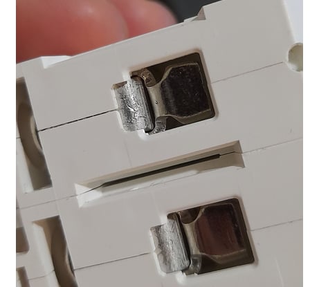 По первому впечатлению, изготовлен качественно. При более внимательном изучении обнаружил, что при плотно затянутых клеммах и любом положении рычажка внутри что-то гремит если встряхнуть. Неподвижная часть клеммы изготовлена из мягкого металла, покрытого светло-серой плёнкой, очень похожего на алюминий. Как туда подключить медные провода без образования гальванической пары?