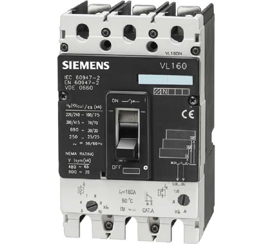 Автоматический выключатель Siemens VL 160N обладает стандартной отключающей способностью ICU=55KA при 415V AC для трехполюсной конфигурации, предназначен для защиты установок.