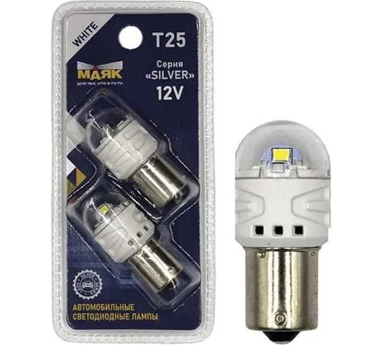 Автомобильная светодиодная лампа МАЯК T25 патрон BA15S для противотуманных фар, стоп-сигналов, указателей поворота 12T25-W/SL13/2BL