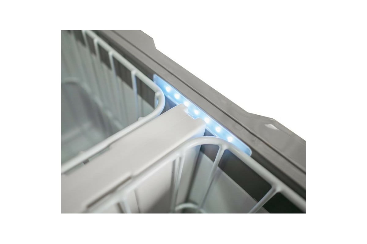 При открытии автохолодильника срабатывает датчик, за счет чего сразу же включается внутреннее освещение, равномерно распределяющее свет на оба отсека (даже при выключенном питании).