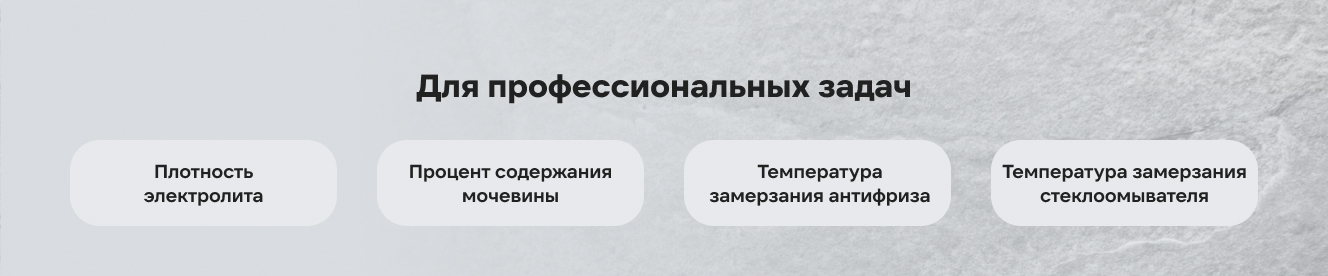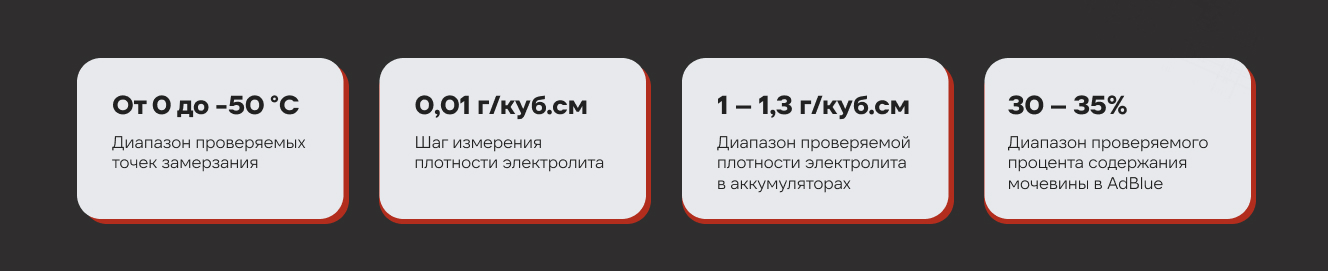 - Диапазон проверяемой плотности аккумуляторов: 1 г/см³— 1,3 г/см³