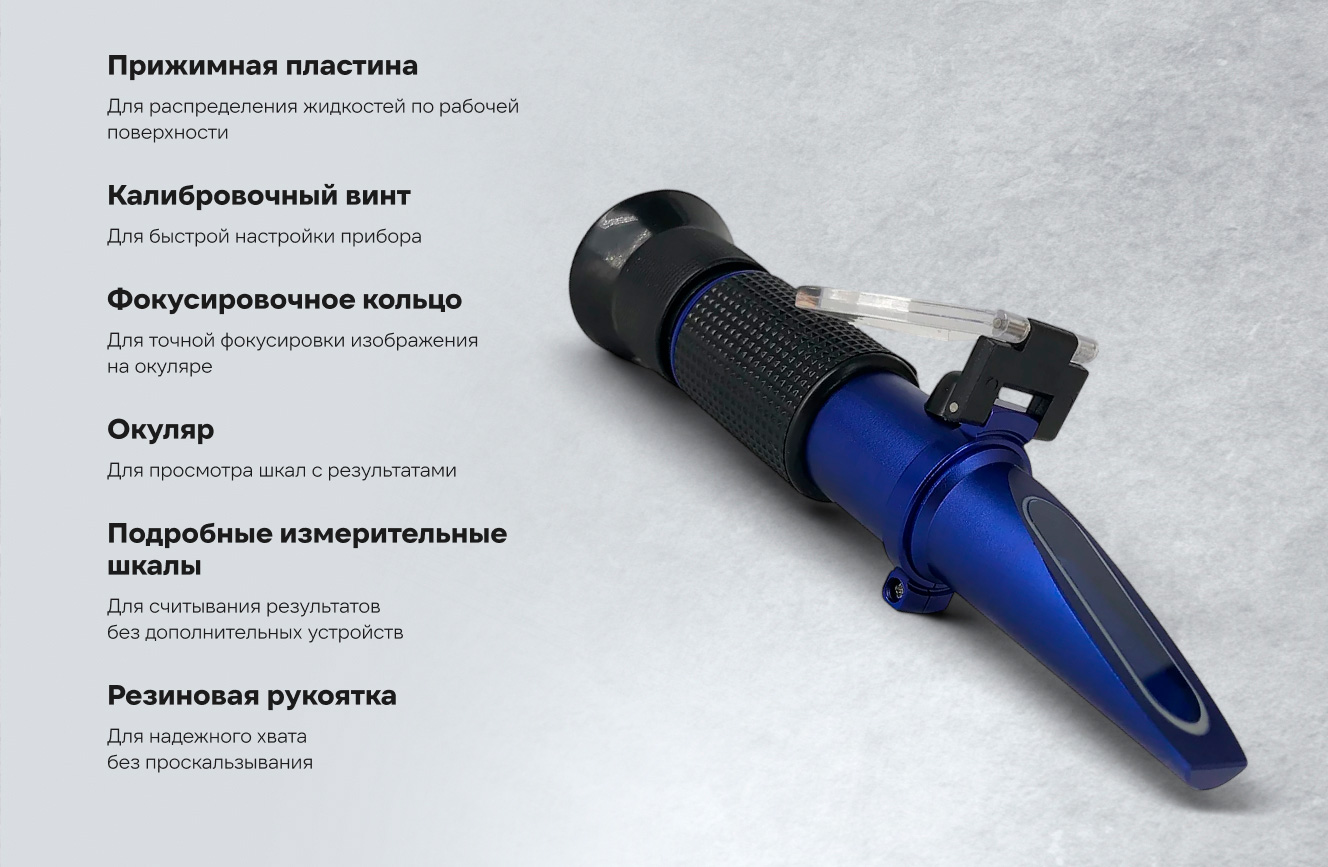 - Открыть крышку, удалить воду и протереть призму и крышку мягкой тряпочкой> капнуть образец измеряемой жидкости на призму> закрыть и прижать стекло> нужное значение находится на границе голубой и белой полосы