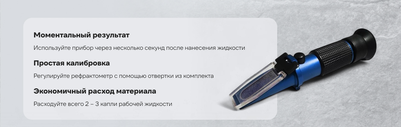 - Интуитивно понятный принцип работы: всего 2-3 капли жидкости — и результат наглядно отображается на шкале