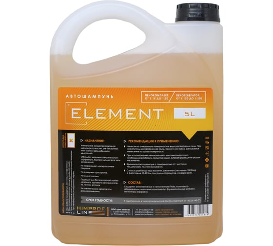 Element: Мощный состав, подходит для загрязнений любого вида! Отличное пенообразование. Не повреждает лакокрасочные покрытия. Не содержит фосфатов. Не имеет запаха. Не меняет своих свойств при размораживании. Идеален для любого вида оборудования. Концентрация: пенокомплект: от 1:15 до 1:20; пеногенератор: от 120 до 1:150.