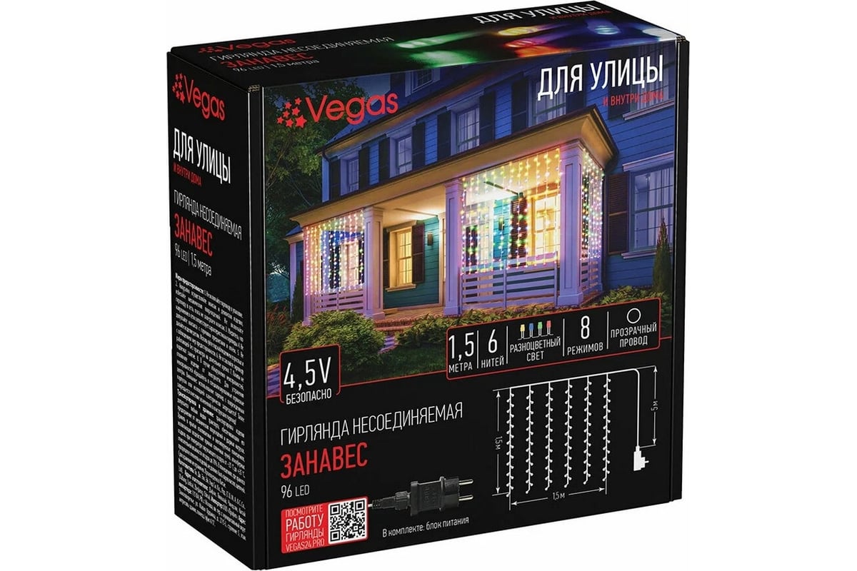 Электрогирлянда VEGAS BALANCE 4,5V "Занавес" 96 разноцветных LED ламп, прозрачный провод, 6 нитей, 1,5*1,5 м, 8 режимов, с блоком питания /32/4 56125