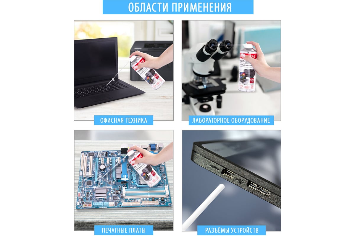 Подходит для очистки поверхностей печатных плат, линз оптических приборов, лабораторного, диагностического и другого деликатного оборудования. Распылительная головка с трубочкой позволяет контролировать направление и силу струи очистителя. Не оставляет следов при распылении.